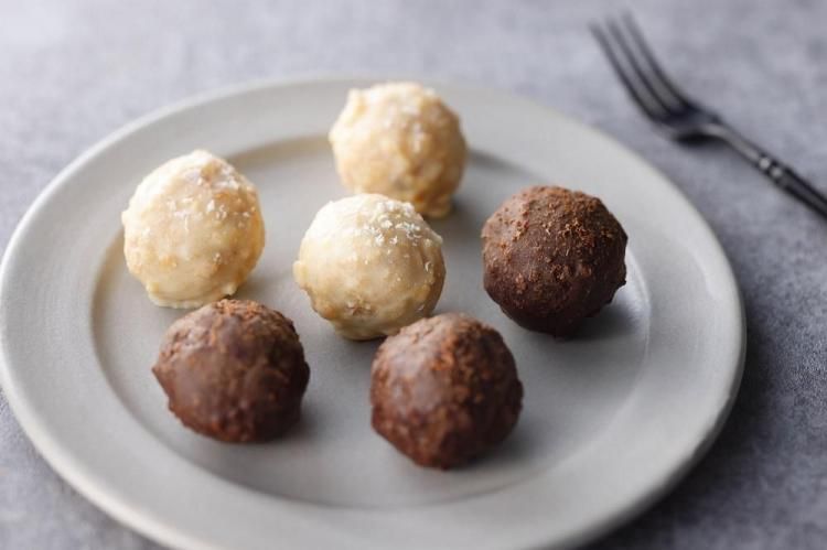 『長崎カステリーヌ』のテリーヌとカステラ生地をコロンっと小さなケーキに成形し、プレーンにはあんず、ショコラにはいちじくの香り豊かなドライフルーツを閉じ込めて味のアクセントに。コク深いチョコレートでコーティングし、果実とショコラの風味豊かな2種のひと口ケーキに仕上げました。