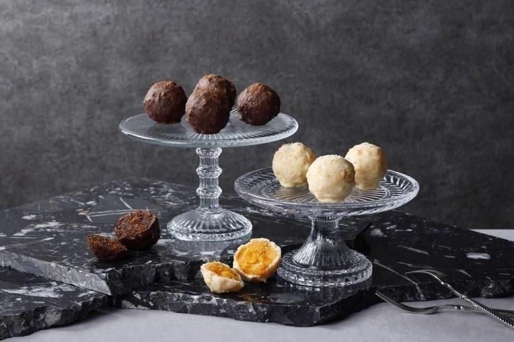 『長崎カステリーヌ』のテリーヌとカステラ生地をコロンっと小さなケーキに成形し、プレーンにはあんず、ショコラにはいちじくの香り豊かなドライフルーツを閉じ込めて味のアクセントに。コク深いチョコレートでコーティングし、果実とショコラの風味豊かな2種のひと口ケーキに仕上げました。