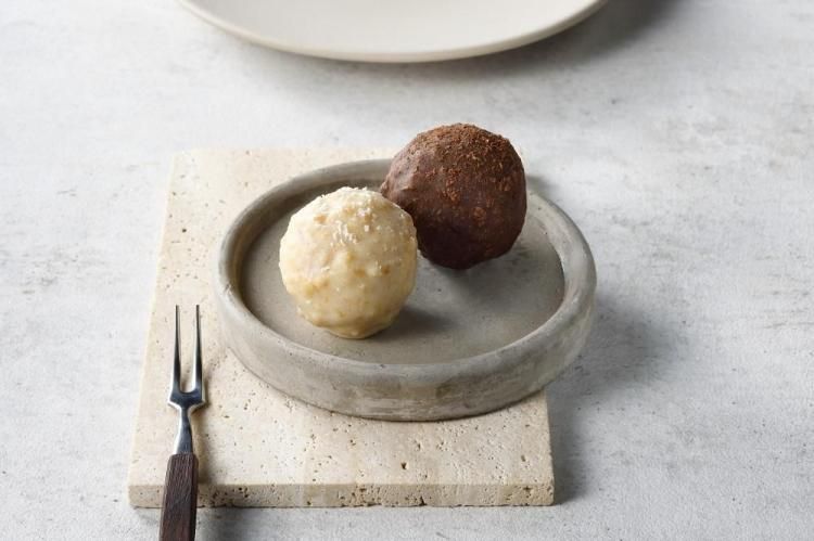 『長崎カステリーヌ』のテリーヌとカステラ生地をコロンっと小さなケーキに成形し、プレーンにはあんず、ショコラにはいちじくの香り豊かなドライフルーツを閉じ込めて味のアクセントに。コク深いチョコレートでコーティングし、果実とショコラの風味豊かな2種のひと口ケーキに仕上げました。